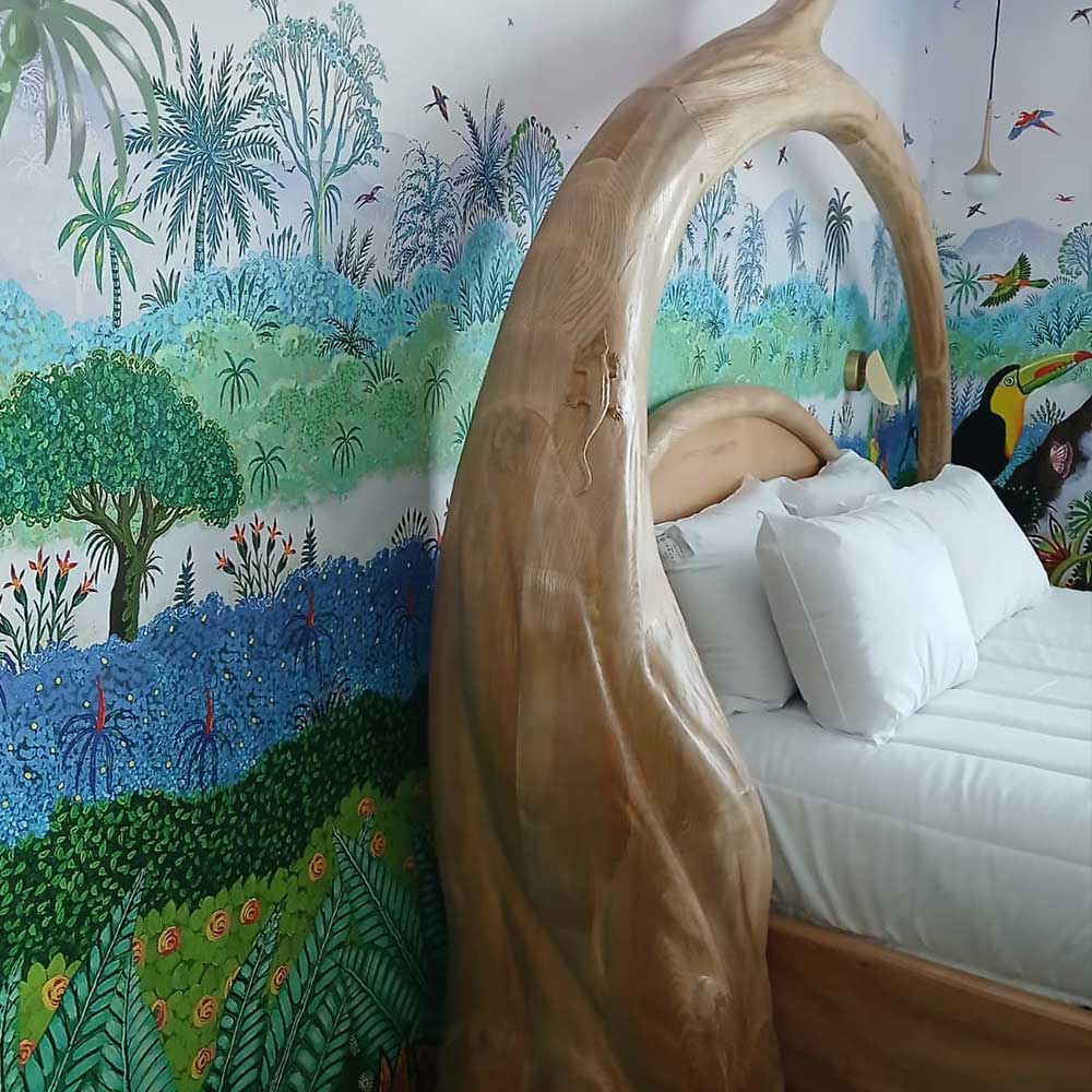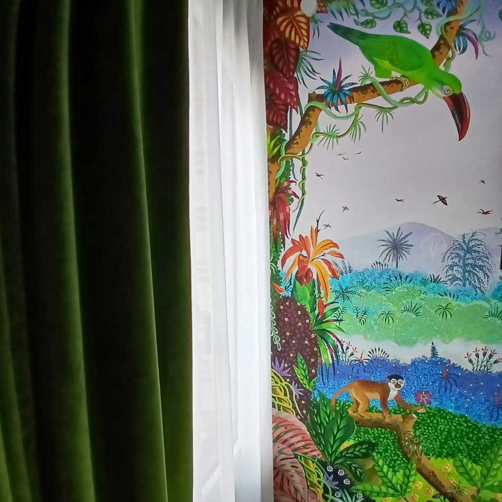 Dès les premiers pas, les repères s’effacent. Les murs, le plafond, les moindres recoins de la pièce s’animent d’une nature foisonnante : forêts luxuriantes, oiseaux exotiques, feuillages éclatants, lumières vibrantes. Vous êtes ailleurs. En voyage. Hors du temps.